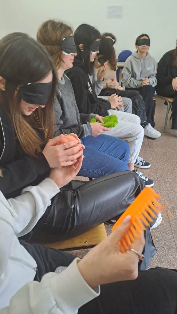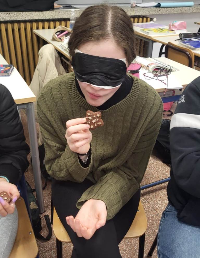 Da questo progetto ho imparato veramente tanto. Ho capito che perdere un senso è difficile. Non riesco a comprendere come loro facciano, come loro siano forti ad affrontare tutto questo ogni giorno e mi ha colpita davvero come per loro non sia un peso, anzi un punto di forza… Come la loro memoria sia così forte. Si ricordano tutto, persino i nomi di tutta la classe detti al volo un secondo prima. Ci hanno bendato e avevo un senso di ansia, non sapevo cosa mi aspettava, non sapevo cosa avrei toccato, annusato o assaggiato, ogni volta cercavo di toccare la mia compagna a fianco a me per capire cosa mi circondava, anche per sapere se fosse tutto a posto. Li ammiro veramente tanto, vorrei anche rincontrarli un giorno anche solo per salutarli, soprattutto la signora Elisabetta, che ci ha accompagnati nel progetto e nella prima ora ci ha parlato di come tutti siamo diversi, di come tutti sono speciali anche con degli ostacoli. Questo progetto mi ha lasciato molto dentro, mi sono portata a casa un pezzo in più… Vorrei rifarlo.