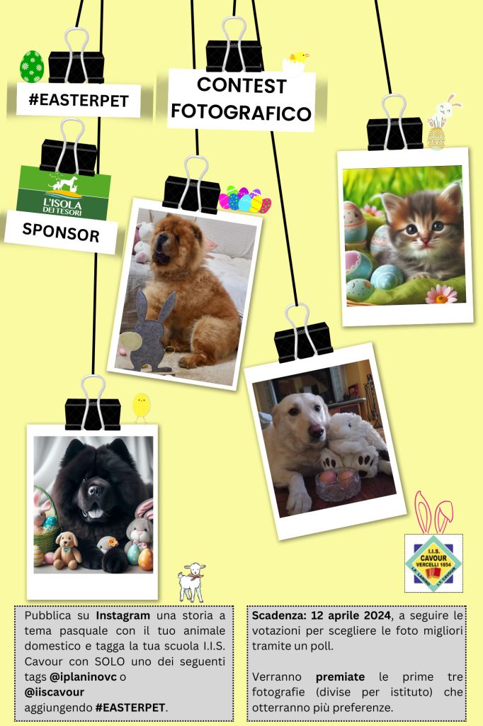 Gli studenti e le studentesse dovranno pubblicare una storia a tema pasquale su Instagram con il loro animale amico, taggando solo la loro scuola, o @iplaninovc o @iiscavour aggiungendo l’#EASTERPET. La scadenza sarà il 12 aprile.