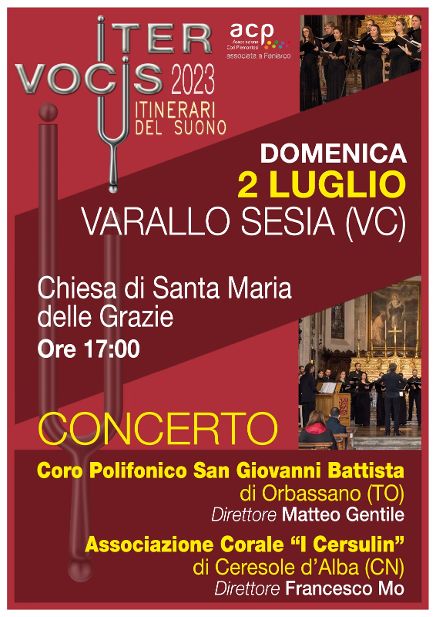 Associazione Cori Piemontesi indice ed organizza anche per l’anno 2023 il percorso concertistico “Iter Vocis”, che mette in rete i territori della Regione in un cartellone unico organizzato dai singoli Consiglieri Provinciali.