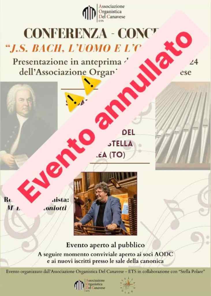 IVREA – Annullata la Conferenza-Concerto “J.S. Bach, l’uomo e l’organista” a cura dell’Associazione Organistica del Canavese