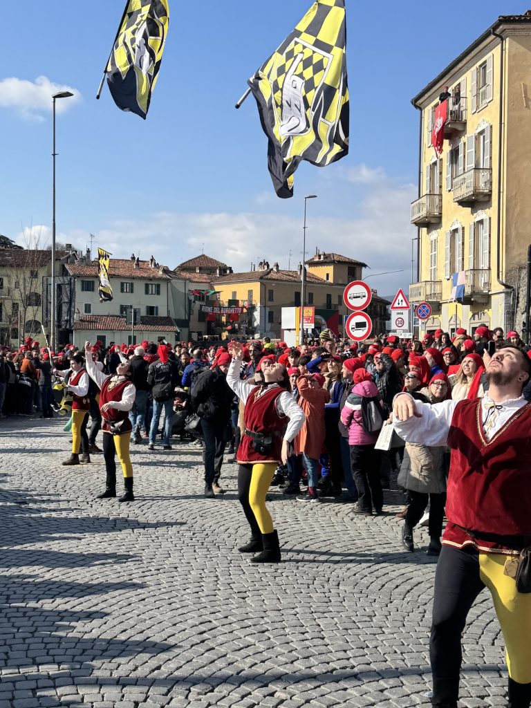 La giornata si è aperta con il Gruppo Storico dei Credendari, gli Armigeri e il Magnifico Podestà, protagonisti di momenti di grande valore simbolico. Come da tradizione, si sono ritrovati in Piazza di Città, che nel frattempo – al pari delle altre piazze – si riempiva di ordinate file di cassette colme di arance, pronte per la battaglia pomeridiana.