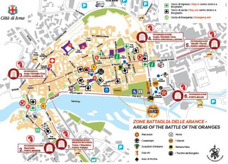 Si ricorda inoltre che è vietato l’accesso alle aree della Battaglia delle Arance con passeggini e carrozzine: via Palestro, Piazza Ottinetti, Piazza di Città, Borghetto.