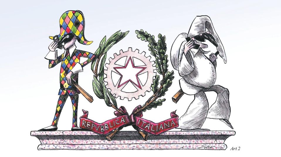 L’immagine simbolo della mostra è l’Articolo 2 della Costituzione sui diritti inviolabili: Arlecchino (il nord) e Pulcinella (il sud), ai lati del simbolo della Repubblica, si telefonano unendo così le due parti dell’Italia.