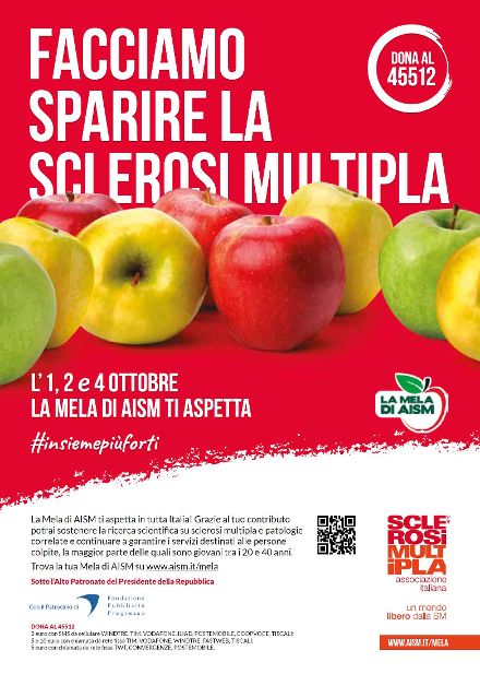 “La Mela di AISM” è l’evento di informazione, di sensibilizzazione e di raccolta fondi promosso dall’ Associazione Italiana Sclerosi Multipla che si svolge sotto l’Alto Patronato del Presidente della Repubblica e con il patrocinio della Fondazione Pubblicità Progresso.