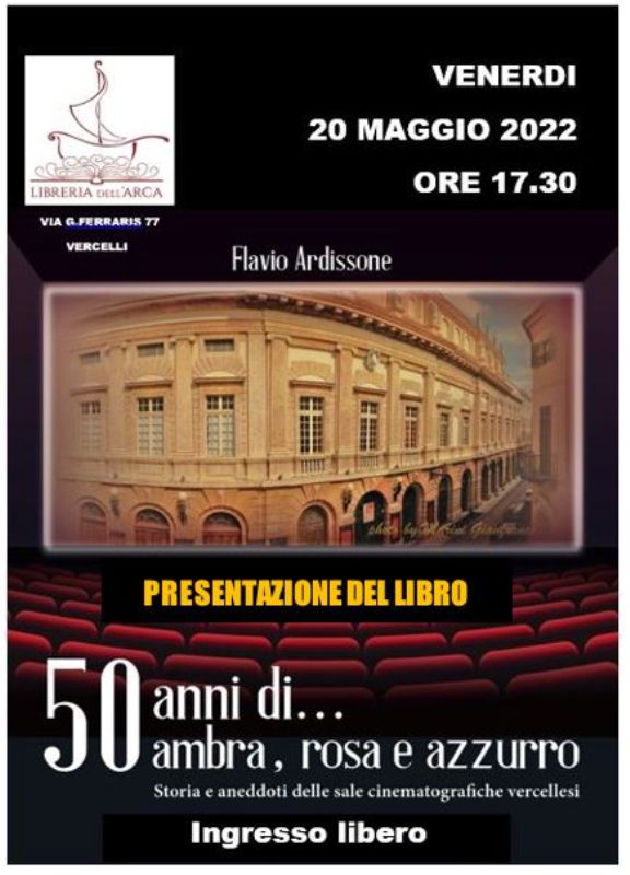 Il vercellese Flavio Ardissone presenterà oggi, venerdì 20 maggio alle ore 17,30 alla Libreria dell’Arca, il suo libro 50 anni di… ambra, rosa e azzurro, saggio fotografico sulla storia del cinema e dello spettacolo di Vercelli e del vercellese.