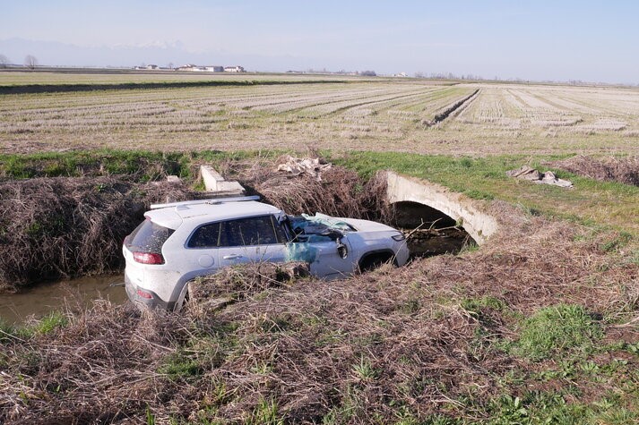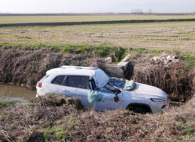 Per cause che sono al vaglio degli Inquirenti (sul posto il Servizio 118, oltre ai Vigili del Fuoco ed i Carabinieri) una Jeep è finita fuori strada, rovinando nel cavo irriguo che costeggia la massicciata stradale, fermando la propria corsa contro il manufatto di un piccolo ponte in muratura che porta al piano di campagna: non sono coinvolte altre vetture.