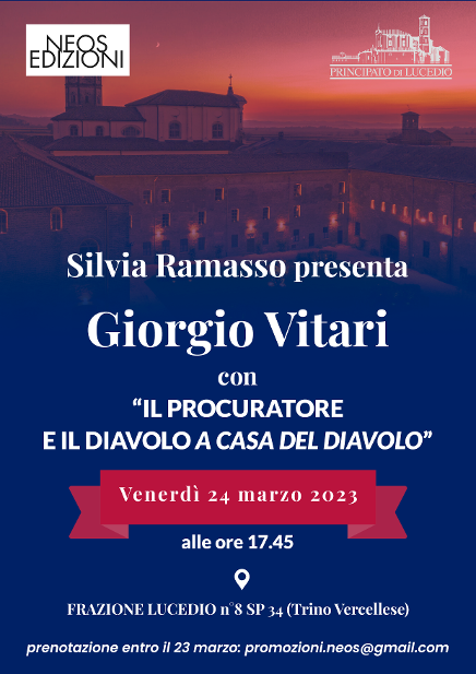 Il Principato di Lucedio in collaborazione con NEOS Edizioni, venerdì 24 marzo 2023 alle ore 17.45 presentano nella sala capitolare dell’abbazia (Frazione Lucedio n. 8 SP 34 Trino Vercellese) il libro “Il procuratore e il diavolo di Lucedio” nell’ambito dell’evento: “Il procuratore e il diavolo a casa del diavolo”.