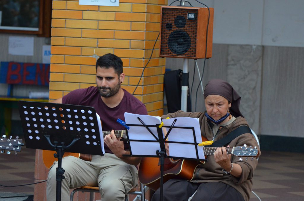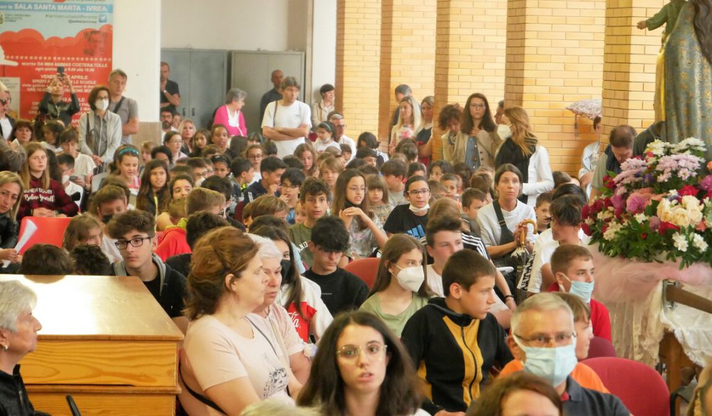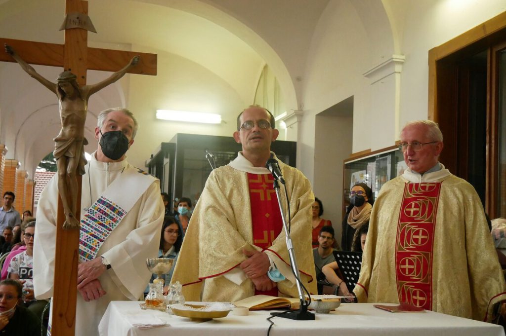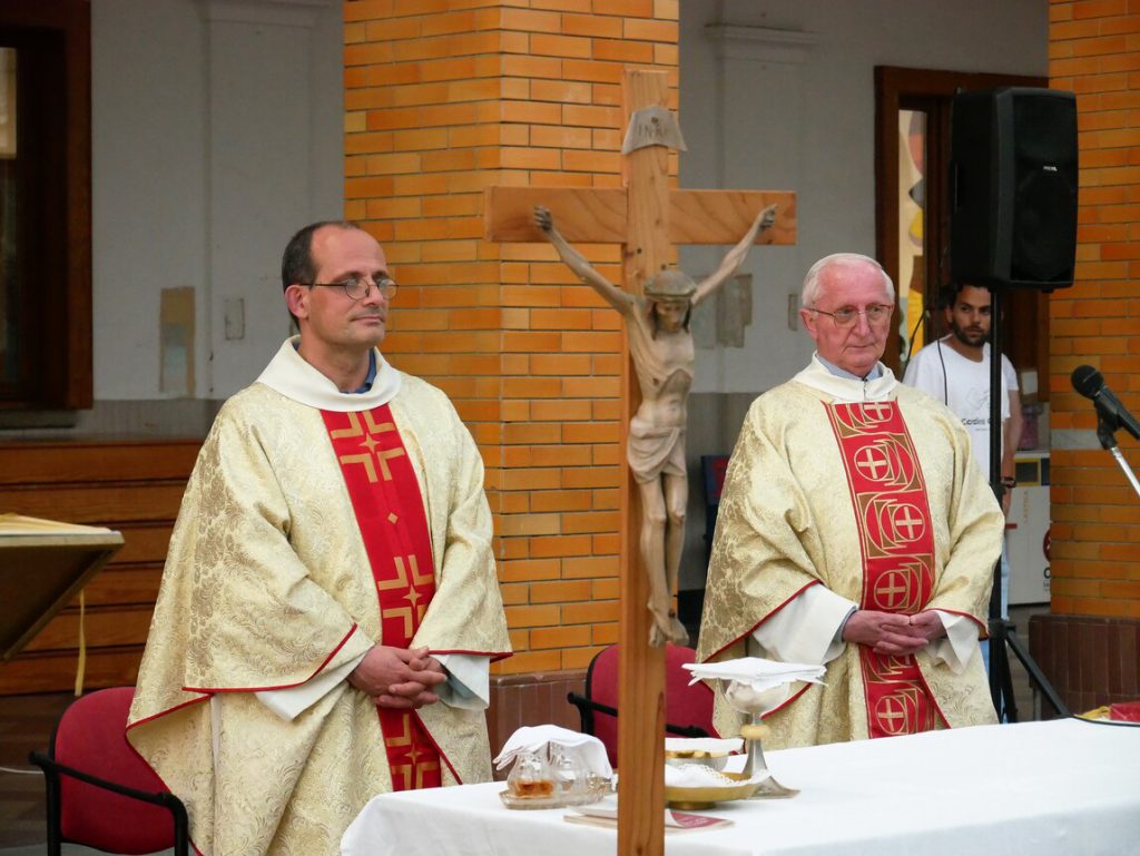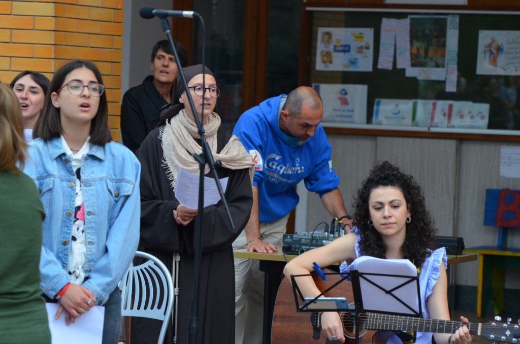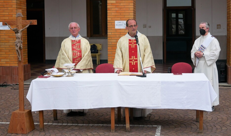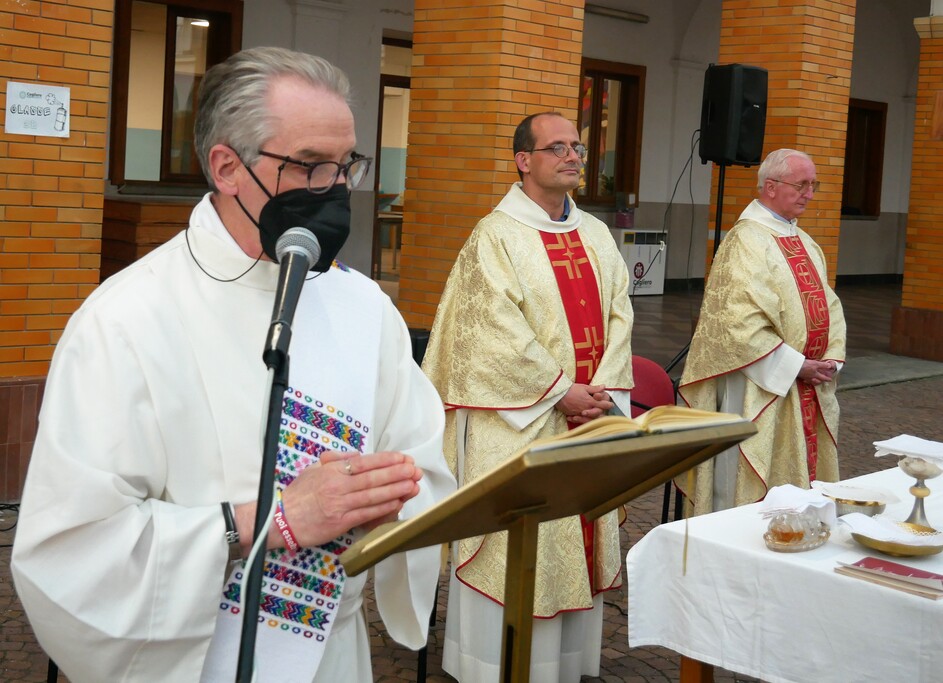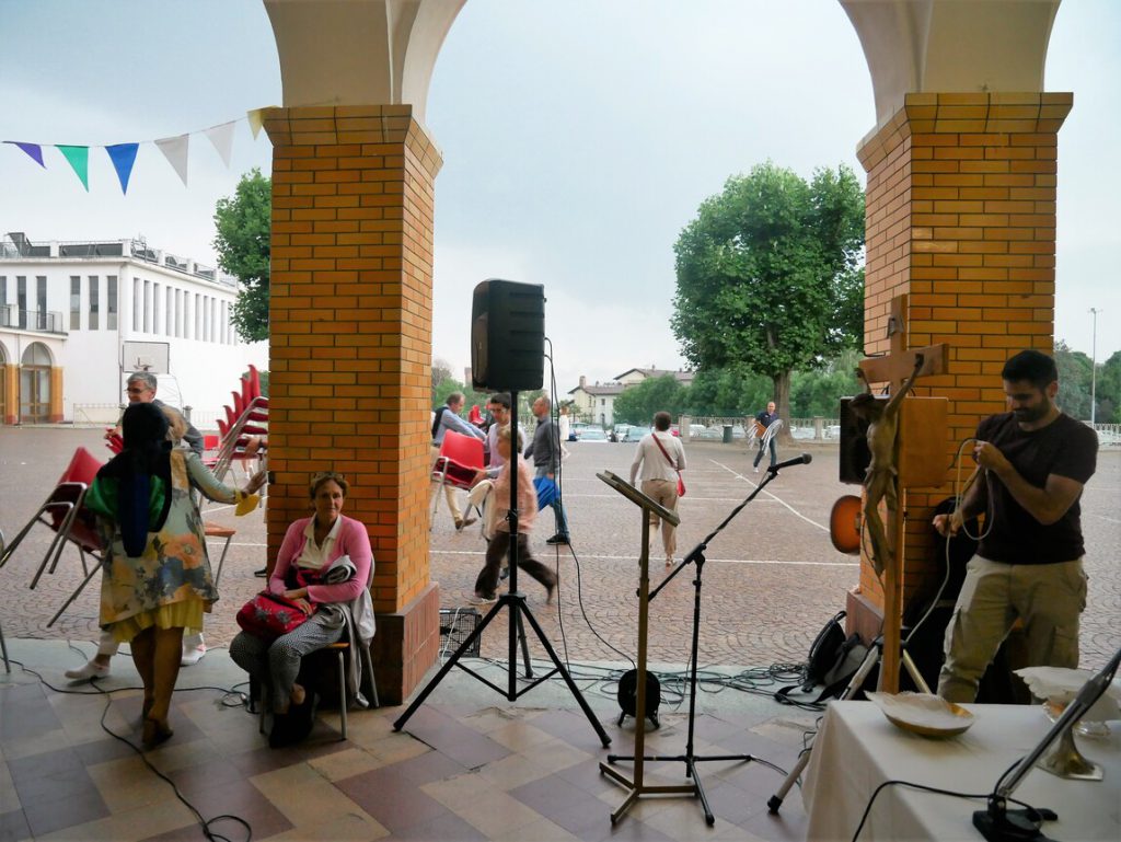 In pochi minuti (anche questo “esodo”, nel filmato) tutti i presenti hanno trasferito sedie, altare, Crocifisso, effige di Maria Ausiliatrice, sotto l’ampio ed accogliente porticato. Tutto: chitarre ed amplificatori compresi, i ferri del mestiere di una corale davvero bravissima che ha animato la liturgia.