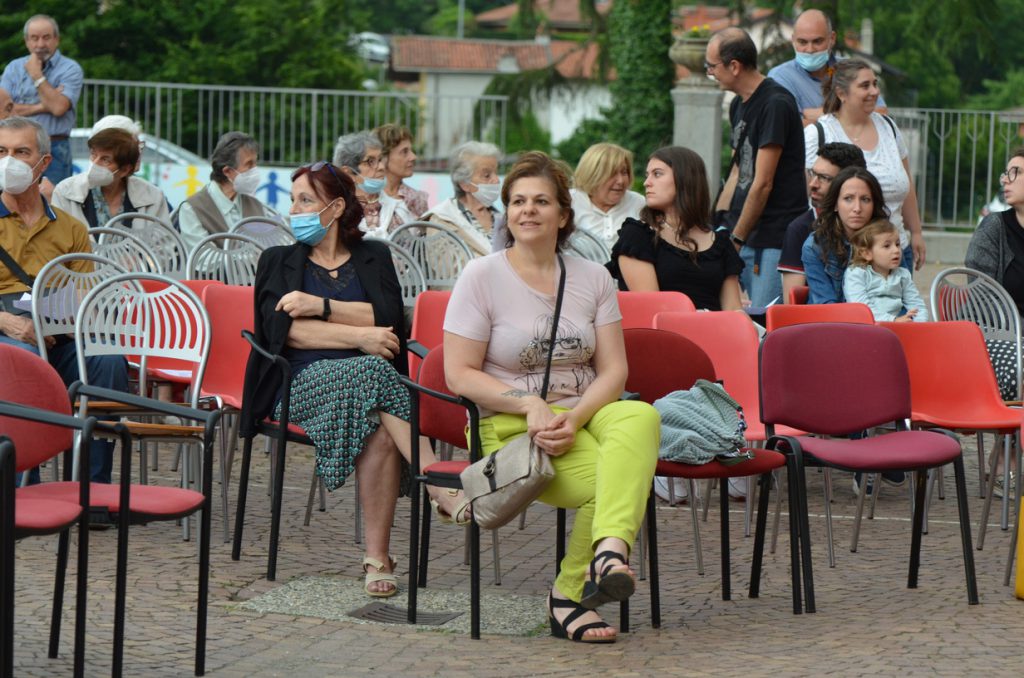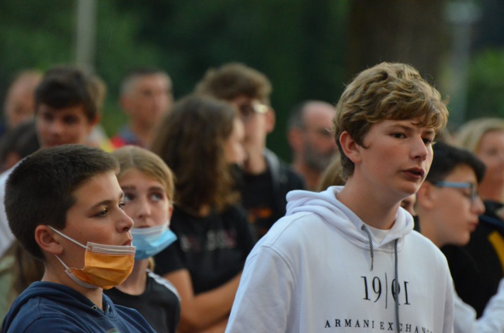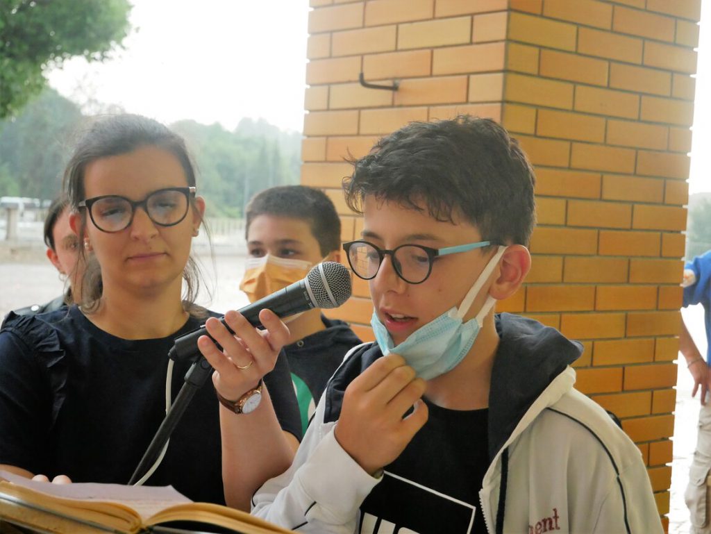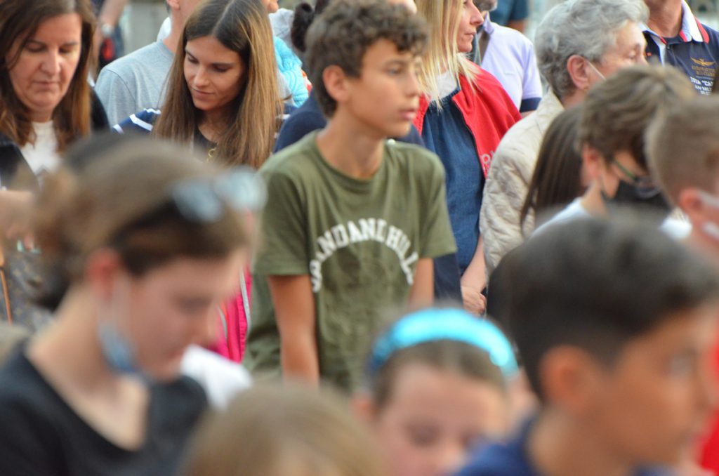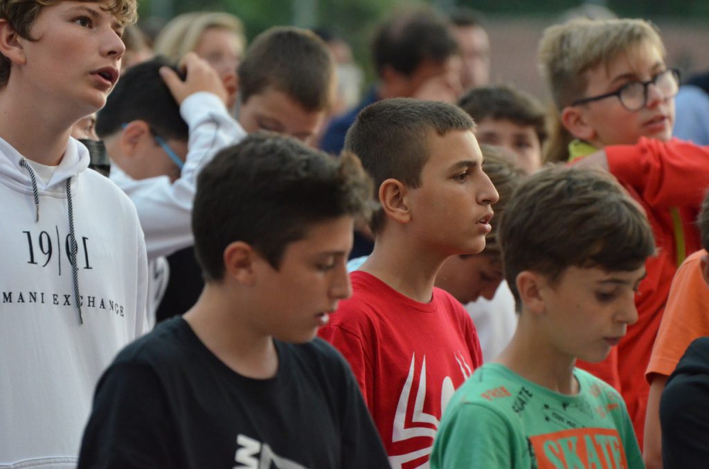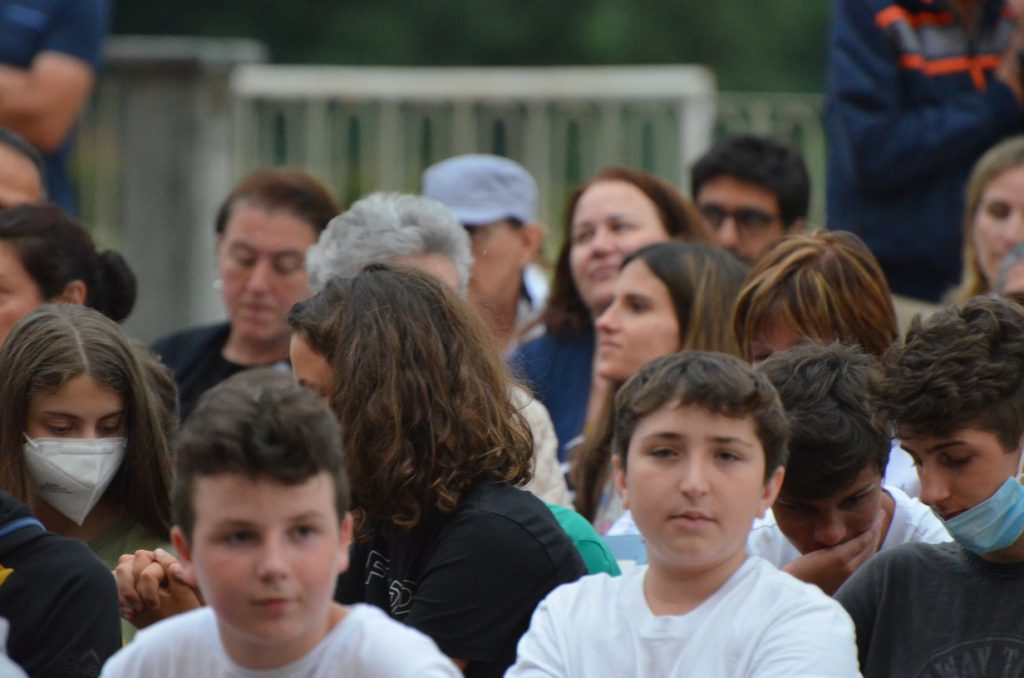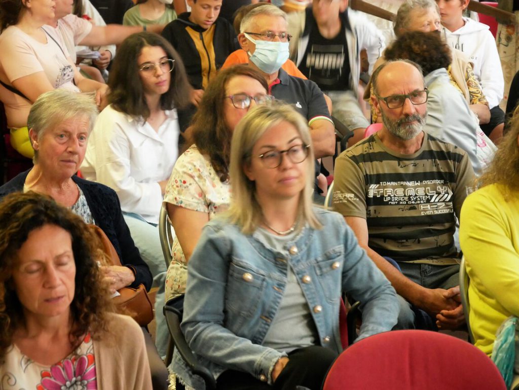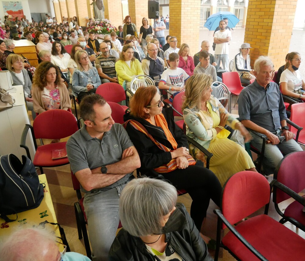 In pochi minuti (anche questo “esodo”, nel filmato) tutti i presenti hanno trasferito sedie, altare, Crocifisso, effige di Maria Ausiliatrice, sotto l’ampio ed accogliente porticato. Tutto: chitarre ed amplificatori compresi, i ferri del mestiere di una corale davvero bravissima che ha animato la liturgia.