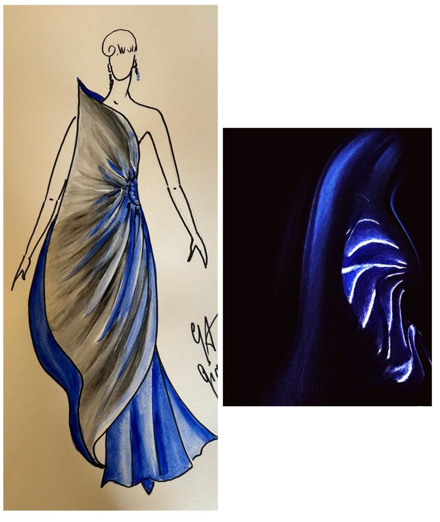 Tra gli abiti della collezione anche un vestito realizzato dal Maestro Tolentino ispirandosi al glicine di Palazzo Tartara a Vercelli , un omaggio alla sig.ra Autilia, madre dell’ artista Lo Mastro.