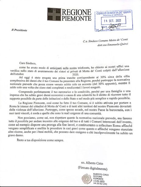 MOTTA DE' CONTI - Ristoro ai privati per i danni dell'alluviosne del 2 e 3 ottobre. Il Presidente della Regione Cirio risponde alla lettera del sindaco Quirci