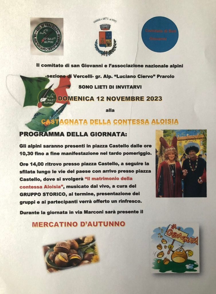 L’evento, organizzato dal comitato di San Giovanni e dall’Associazione Nazionale Alpini – sezione di Vercelli – Gruppo Alpini “Luciano Ciervo” di Prarolo, vedrà la castagnata degli Alpini di Prarolo contornata dal Mercatino d’autunno su via Marconi (numerosi banchetti saranno presenti ad allietare la giornata) e dalla sfilata del gruppo storico i Conti della Motta.