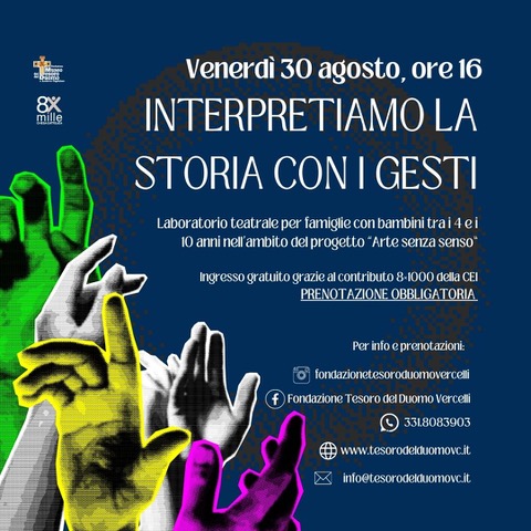 Venerdì 30 agosto alle ore 16 saranno nuovamente protagoniste le famiglie con un altro evento legato al progetto Arte senza senso. Il titolo del laboratorio è Interpretiamo la storia con i gesti, speciale viaggio nelle modalità di comunicazione alternative, attraverso il gioco, proposto a famiglie con bambini tra i 4 e i 10 anni.