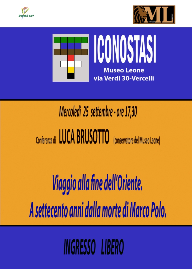 Mercoledì 25 settembre alle ore 17.30 al Museo Leone di Vercelli, nell’ambito della mostra Iconostasi, allestita fino al 29 settembre presso la sezione archeologica, si terrà la conferenza di Luca Brusotto, Conservatore del medesimo museo, dal titolo Viaggio alla fine dell’oriente. A settecento anni dalla morte di Marco Polo.