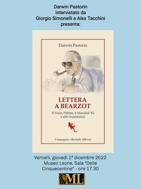 Giovedì 1° dicembre alle 17.30, presso la Sala delle Cinquecentine, con ingresso da Via Verdi 30, il Museo Leone di Vercelli ospiterà la presentazione di Lettera a Bearzot. Il Vecio, Pablito, il Mundial 82 e altri incantesimi, ultima opera di uno degli autori più sensibili e apprezzati del panorama letterario-sportivo italiano e internazionale: Darwin Pastorin, già direttore di Tele +,Stream TV, Sky, ai nuovi programmi di Sky Sport, La7Sport e QuartareteTV.