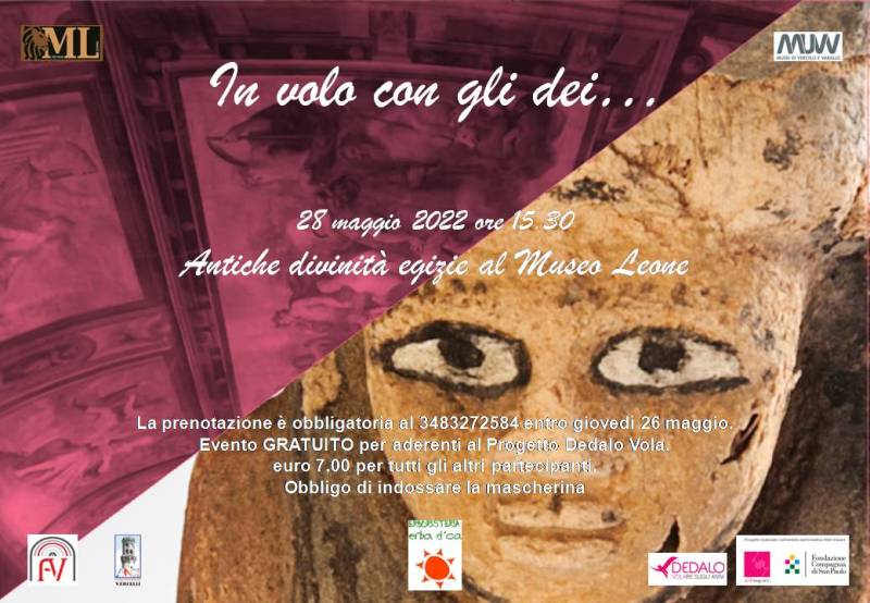 Si svolgerà sabato 28 maggio alle ore 15.30 l’ultimo appuntamento di “In volo con gli dei” al Museo Leone con Dedalo Vola nell’ambito del progetto Well Impact (Fondazione Compagnia San Paolo) che andrà a disturbare le divinità egizie della Sezione Archeologica.