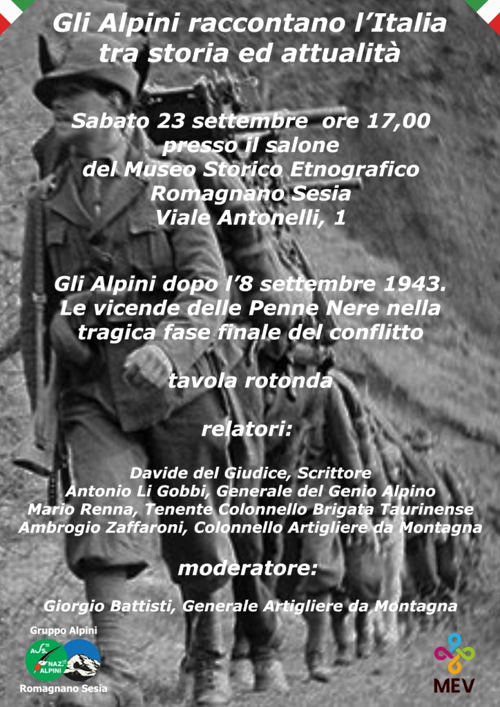 Sabato 23 settembre alle ore 17:00 presso il salone del Museo Storico Etnografico della Bassa Valsesia si terrà il convegno “Gli Alpini dopo il 1943. Le vicende delle Penne Nere nella tragica fase finale del conflitto.”
