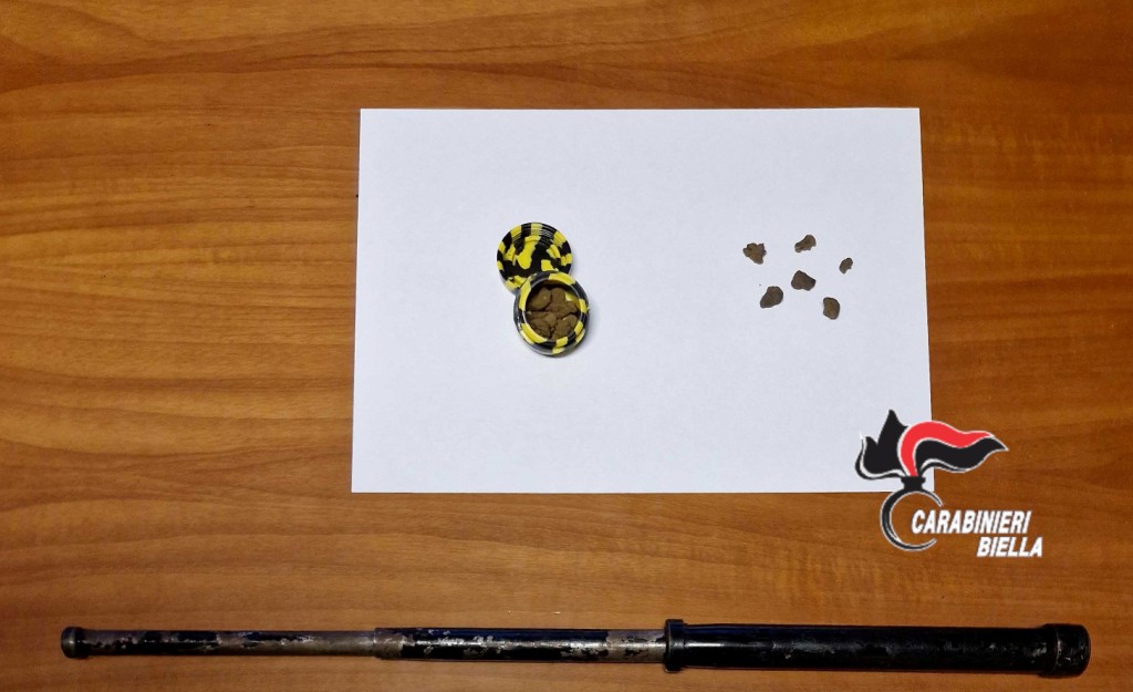 All’interno dell’abitacolo del veicolo, è stato rinvenuto un bastone rigido telescopico il cui possesso risultava ingiustificato, mentre in tasca ai ragazzi, a seguito di perquisizione personale, venivano trovati, al 25enne, grammi 0,5 circa di sostanza stupefacente del tipo “hashish” ed al 23enne di Cossato grammi 1,00 circa della medesima sostanza.