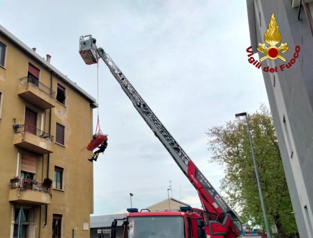 La squadra arrivata sul posto si è interfacciata con il personale sanitario presente sul posto per il trasporto dell’infortunato dal quarto piano fino a terra.
