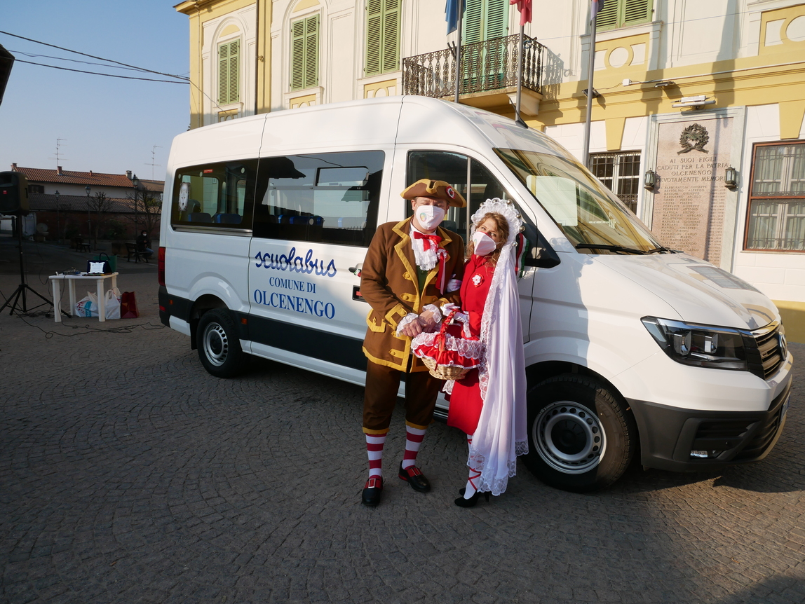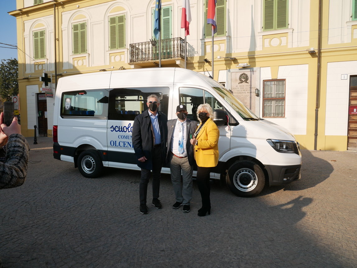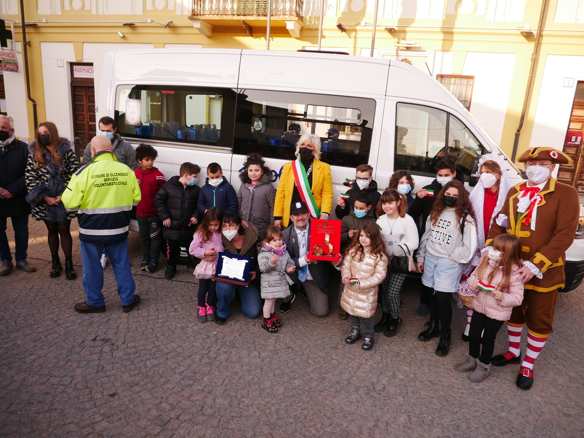 Cerimonia molto semplice e senza “fronzoli” quella che ha visto, ieri, sabato 5 febbraio, il “taglio del nastro” di un pullmino nuovo fiammante, destinato a trasportare i bambini della scuola Primaria che risiedono ad Olcenengo e nei paesi vicini.