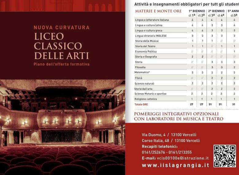 La novità: l’offerta formativa dell’IIS “Lagrangia” si arricchisce a partire da quest’anno con la nuova curvatura del Liceo Classico, ovvero il Liceo Classico delle Arti che si aggiunge alle già attive curvature con potenziamento linguistico-scientifico e giuridico-economico.