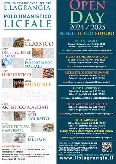 Nel pomeriggio, dalle ore 14 alle ore 17, il volto del “Lagrangia” si completerà con gli indirizzi di via Duomo, il Liceo Classico e il Liceo Economico Sociale.