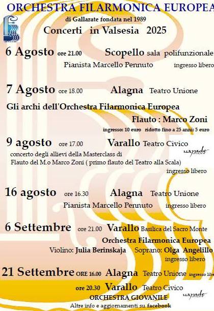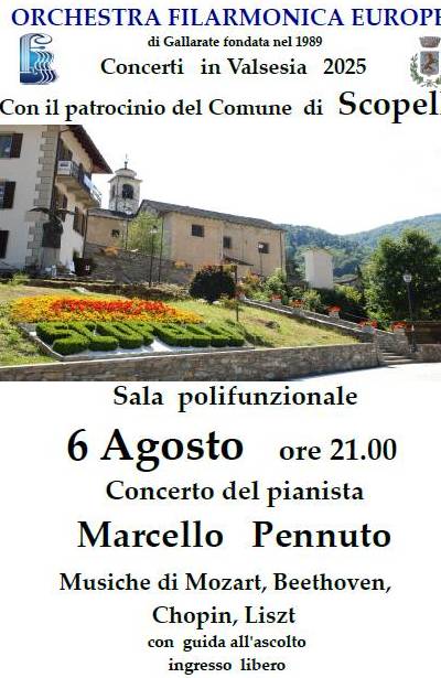 ORCHESTRA FILARMONICA EUROPEA - Al via una serie di Concerti in Valsesia in alcuni dei luoghi più significativi del territorioPrimo appuntamento a Scopello con il M.o Pennuto nella veste di pianista Cultura e Spettacolo 03/08/202503/08/2025 Valsesia e Valsessera