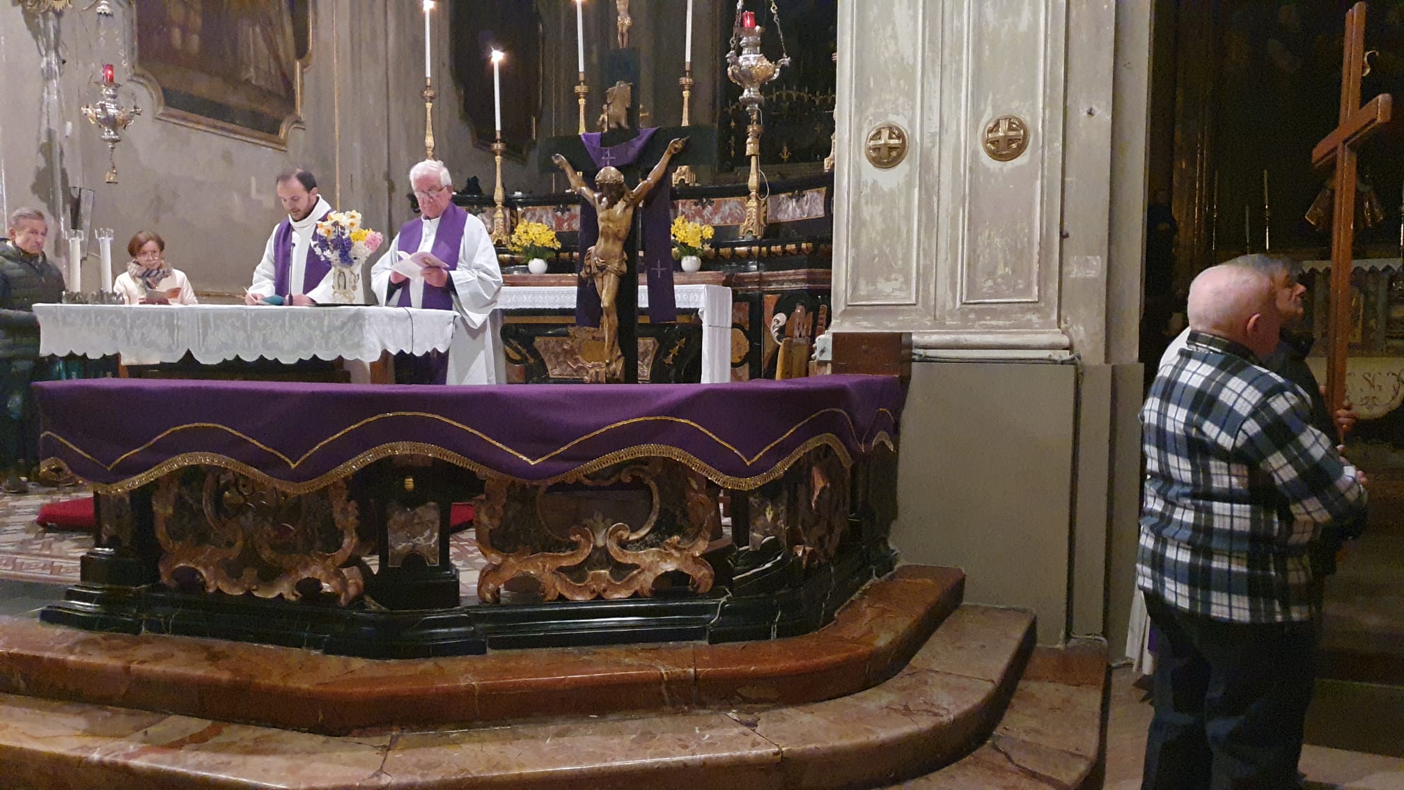 La chiesa grazie alle preziose attenzioni della signora Luciana Zandarin, si presentava ben pulita e curata nei minimi particolari, con copri balaustra viola ben stirati, candide tovaglie e fiori freschi sull’altare.