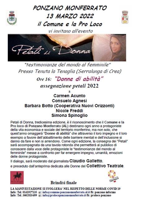 Era all’insegna di queste parole l’annuncio dell’edizione 2020 di “Petali di Donna”, il premio voluto da Comune e Pro loco di Ponzano Monferrato per celebrare l’impegno al femminile nei vari ambiti della società. Un annuncio troncato improvvisamente dal rapido dilagare della pandemia che aveva improvvisamente bloccato eventi e manifestazioni impedendo la consegna del riconoscimento alle “Donne di Abilità” dell’allora tredicesima edizione del Premio, selezionate per il loro esempio nel porre l’accento sulla valorizzazione in positivo delle diversità e nel superamento del concetto di “disabilità”.