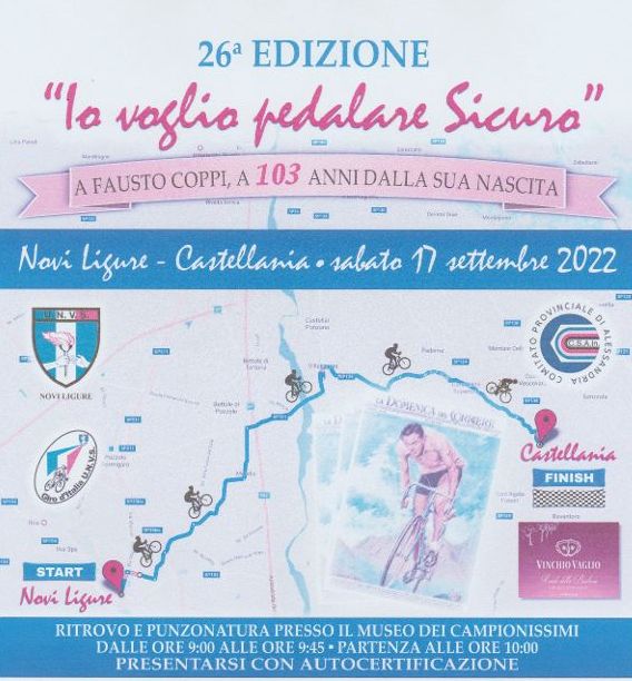 Mentre la seconda tappa del Giro d’Italia dell’UNVS della sezione UNVS di Novi Ligure in programma sabato 17 settembre, valevole quale 26° edizione Novi-Castellania, Io voglio pedalare sicuro, a Fausto Coppi a 103 anni della sua nascita, manifestazione in collaborazione con il Comitato Provinciale di Alessandria C.S.A.In..