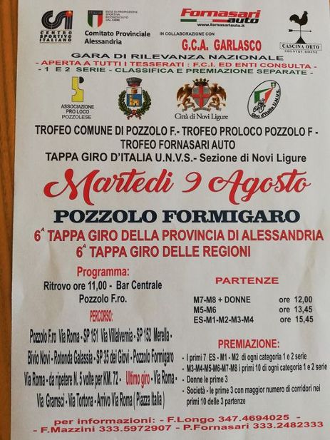 La prima in programma in collaborazione con il Comitato Provinciale CSI di Alessandria per dar vita alla 6° tappa del giro della Provincia di Alessandria, valevole Trofeo Fornasari Auto, Trofeo Comune di Pozzolo Formigaro e Trofeo Proloco Pozzolo Formigaro, la manifestazione si snoderà sul circuito Pozzolo, Frazione Merella, Novi Ligure, Pozzolo Formigaro si svolgerà martedì 9 agosto.