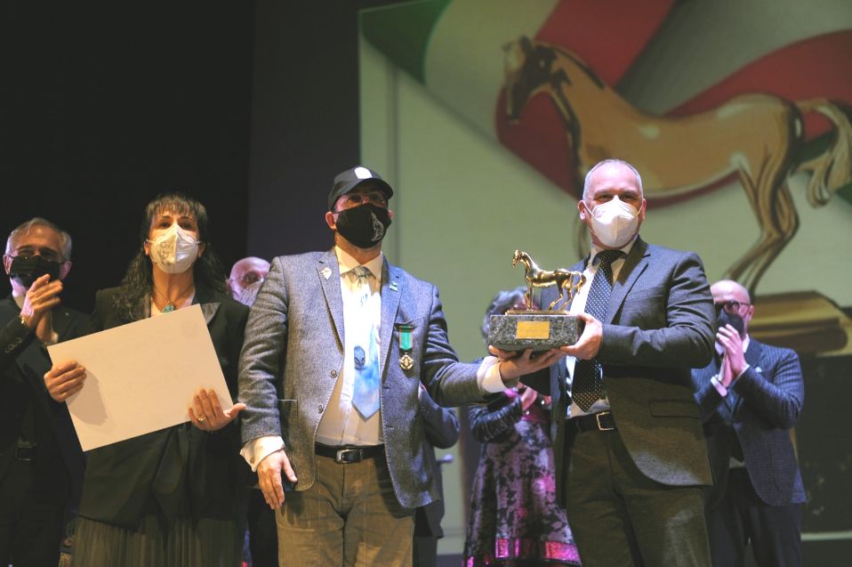 Ingala, che era accompagnato dal suo ex “vice”, il tenente colonnello Andrea Maria Gradante (adesso allo Stato Maggiore dell’Esercito, a Roma) ha ricevuto il riconoscimento – che consisteva in una statuetta d’ottone dorato, con basamento in marmo, appunto rappresentante un cavallo, proprio perché le sue “Voloire” avevano consentito a Olmo di andare a portare migliaia di maschere a Vercelli, come in altri centri della Provincia (e anche a Bergamo), pur in tempo di lockdown. Il sì di Ingala ha probabilmente salvato la vite a parecchi vercellesi, di qui la scelta della commissione allestita da Olmo e composta da da Serena Rubini, che rappresentava il settore artistico; dal rappresentante della società civile Claudio Zammarchi; dall’esponente del settore sanità Katia Morgante; dal rappresentante del mondo dello sport Domenico Limardi; dall’esponente del mondo scolastico Ilaria Ottino; dal rappresentante del settore imprenditoriale Pablo Carrara e dal giornalista Enrico De Maria.