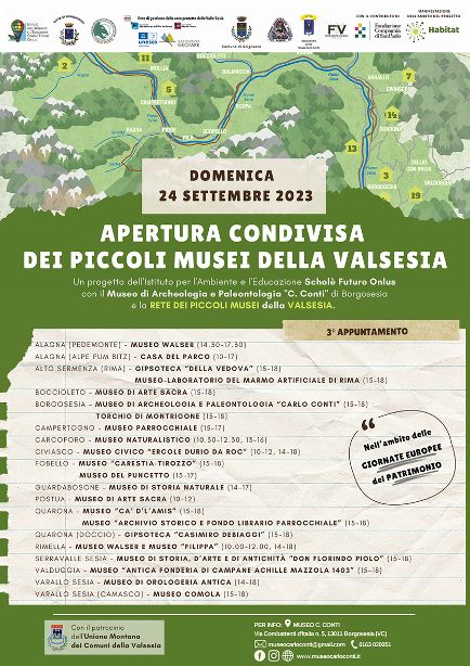 Domenica 24 settembre 2023 i piccoli musei della Valsesia saranno visitabili in occasione dell’ultima giornata di apertura condivisa, promossa dal museo “C. Conti” di Borgosesia nel quadro del Progetto “Habitat. Verso un parco culturale della Valsesia”, sostenuto dalla Fondazione Compagnia di San Paolo di Torino.