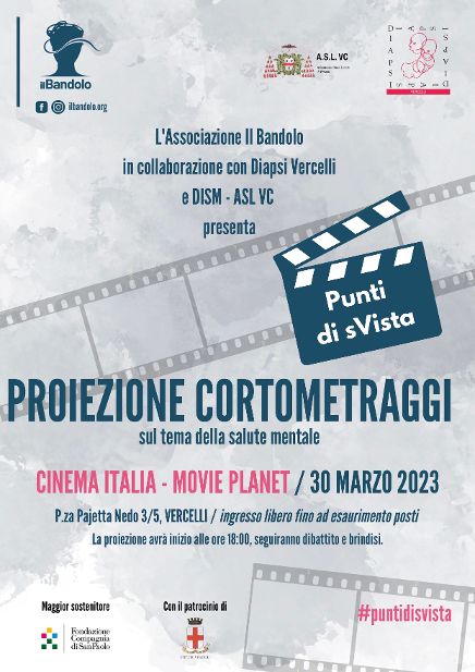 Maggior sostenitore Fondazione Compagnia di San Paolo, con il patrocinio del Comune di Vercelli. “Punti di sVista” è il titolo di un concorso cinematografico che “Il Bandolo” ha promosso nel 2022 e che si rivolgeva a giovani registi per la produzione di cortometraggi e documentari sul tema della salute mentale con 16 corti selezionati e presentati nell’ottobre 2022 a Torino.