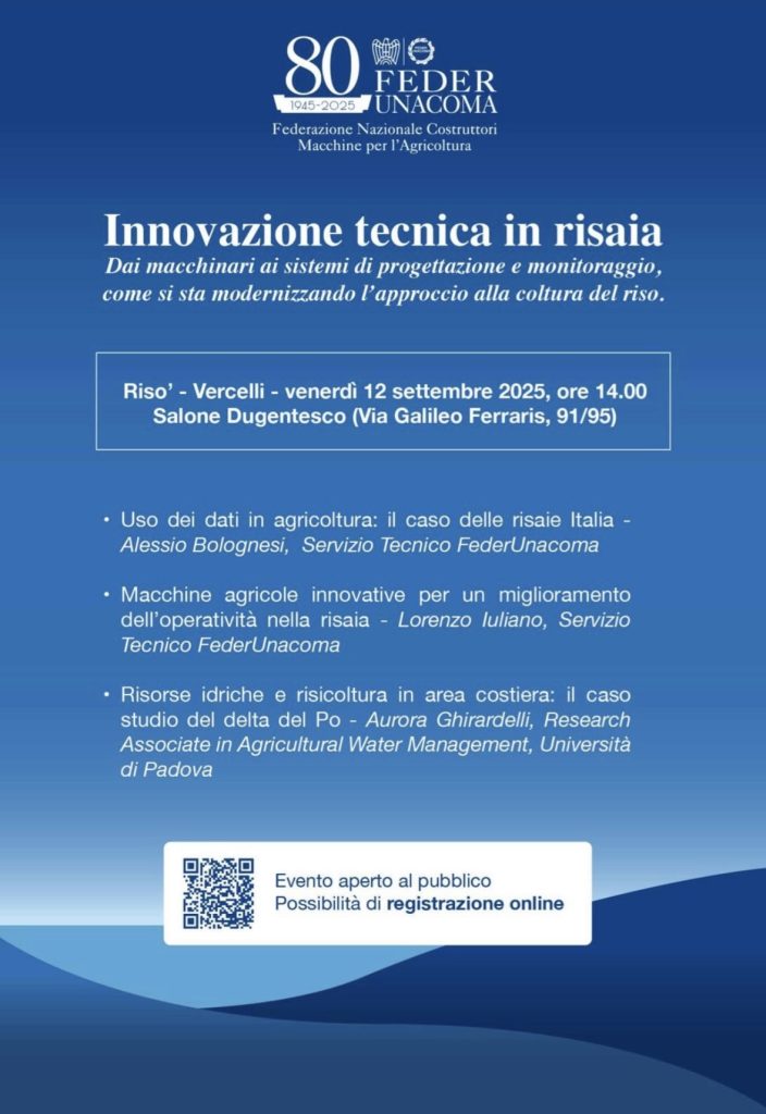 FederUnacoma – la Federazione Italiana dei Costruttori di Macchine per l’Agricoltura – partecipa al Festival Internazionale del Riso di Vercelli (12/14 settembre 2025), con uno stand istituzionale nell’area filiera del Village e un allestimento di macchine e attrezzature per ogni fase della lavorazione del riso presso Via Galileo Ferraris, all’ingresso della rassegna.