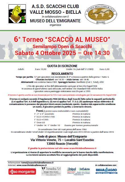 Il Museo dell’emigrante di Roasio, in collaborazione con lo “Scacchi club di Valle Mosso” ospiterà, sabato 4 ottobre ,la sesta edizione del torneo “Scacco al Museo”, semilampo open di scacchi!