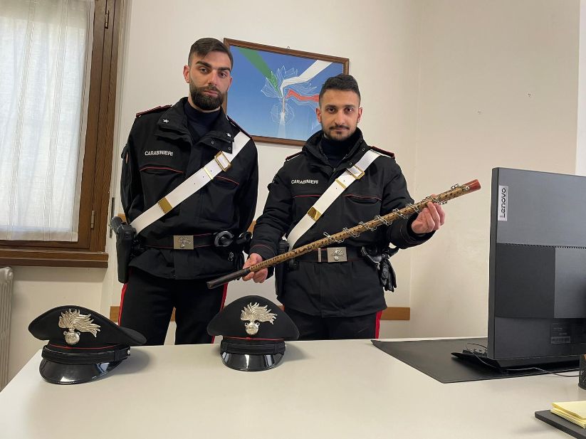 La perquisizione al veicolo, subito attuata, ha consentito di rinvenire una mazza ferrata costruita artigianalmente, costituita da un solido bastone in legno, ricavato dal manico di un piccone, attorno al quale era stato avvolto del filo spinato: un’arma impropria micidiale, se usata per colpire qualcuno con violenza.
