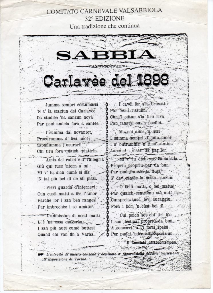 In quel foglio ottocentesco c’è già tutto: l’invito a mascherarsi e cantare, la descrizione del paese in festa, i richiami ironici ai “matti” del Carnevale e persino una finalità concreta, perché l’introito della canzone viene dichiarato come destinato a sostenere una presenza valsesiana all’Esposizione di Torino.