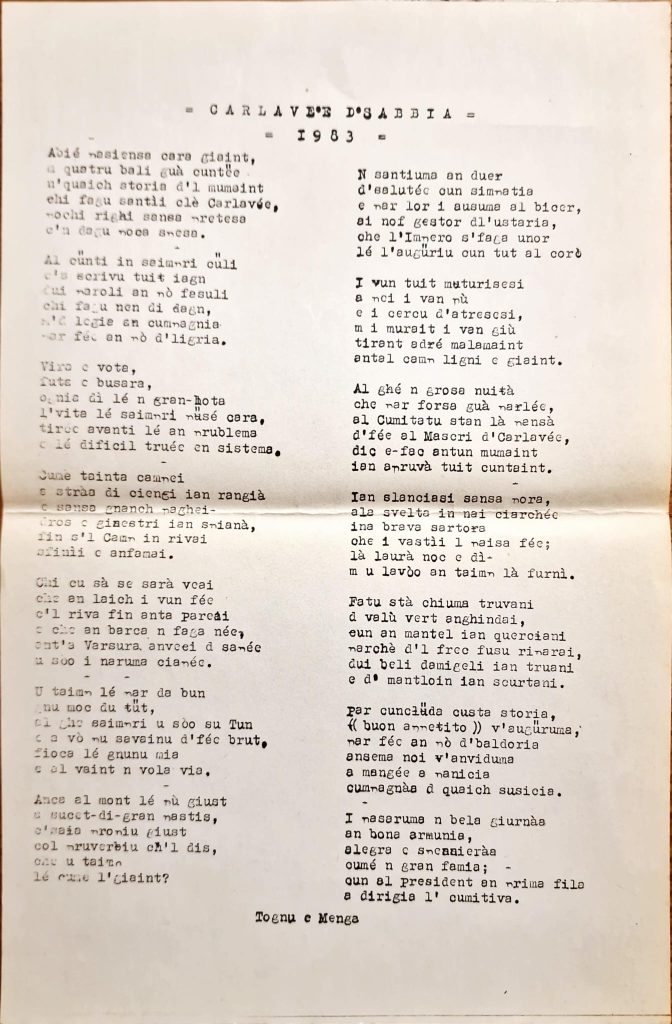 Il passaggio verso la forma moderna del Carnevale sabbiese è invece raccontato da un’altra cansun, datata 1983: è l’anno in cui il Comitato decide di “fare le maschere del Carlavèe”, cercando sarta e costumi, fino a dare vita al gruppo mascherato che ancora oggi rappresenta il volto più riconoscibile della festa, con il Re Tognu e la Regina Menga interpretati per la prima volta da Mariuccia Stragiotti e Sandro Calzoni, a dominare la scena goliardica del paese insieme al seguito.