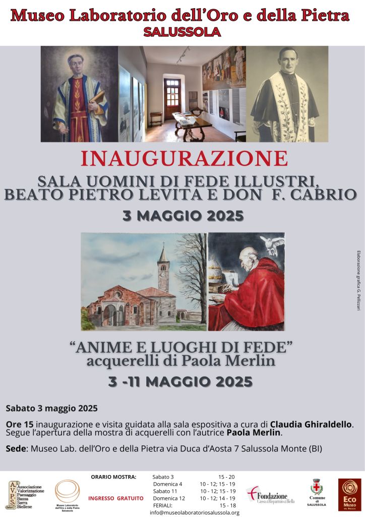 In occasione dell’annuale festa patronale del Beato Pietro Levita sabato tre maggio, il Museo di Salussola inaugura una nuova sala dedicata agli Uomini di Fede Illustri di Salussola, Beato Pietro Levita e don Francesco Cabrio.