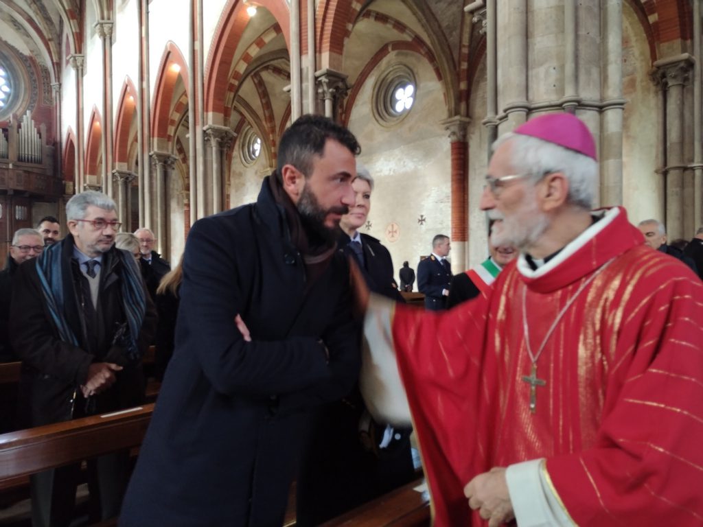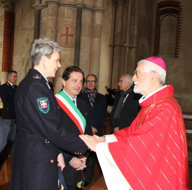 (Stefano Di Tano, per VercelliOggi.it) – E’ stata una mattinata davvero intensa vissuta con particolare attenzione dall’attento pubblico composto da Agenti del Corpo di Polizia Locale con molti ex-Colleghi, le massime Autorità cittadine tra cui l’on. Emanuele Pozzolo, gli Organi di stampa, vari collaboratori del Comune di Vercelli, e i rappresentanti di Associazioni militari e culturali vercellesi. La giornata dedicata alla memoria del Martire San Sebastiano non poteva che iniziare dalla splendida Basilica di S. Andrea nella quale l’Arcivescovo Mons. Marco Arnolfo, durante l’omelia (integrale nel nostro filmato) ha saputo coniugare perfettamente il sacrificio di S. Sebastiano a difesa della sua Fede in Cristo con l’animo collaborativo e puntuale delle Forze di Polizia Locale che si impegnano quotidianamente nella difesa della vita e dell’ordine cittadino nel comune obiettivo della pace e del rispetto delle leggi.
