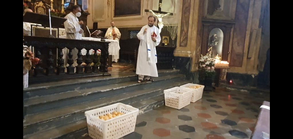 È stata rispettata l’antica tradizione del Pane, davanti all’altare c’erano tre grandi ceste di pane, e don Maggioni nel benedire i pani ha ricordato il miracolo di Tommasino, che ritornato in vita grazie all’intercessione di Sant’Antonio fece nascere la devozione del Pane dei Poveri (detta anche Pane di Sant’Antonio); cioè quella di donare del pane alle persone disagiate, o per una grazia ricevuta tramite l’intercessione del Santo oppure quando si chiede il suo aiuto, il suo intervento nella preghiera. Don Maggioni medita: “Oggi, il pane non è più un alimento così essenziale come lo era in passato, così oggigiorno si incoraggiano i fedeli a continuare la pia devozione del Pane dei Poveri prendendosi cura delle necessità dei poveri”.