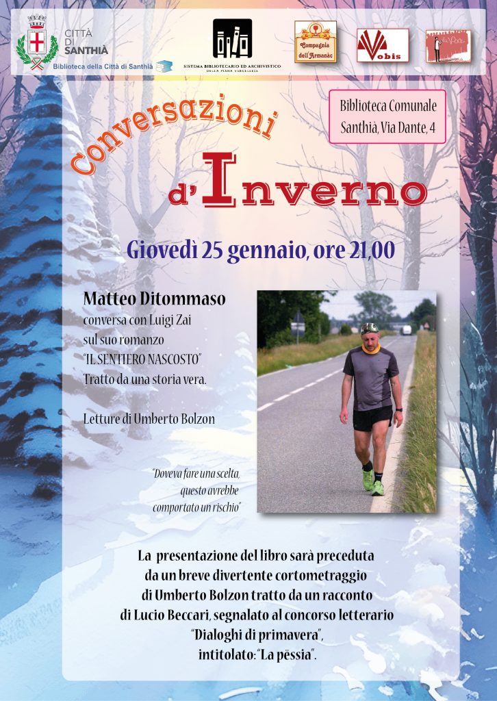 Giovedì 25 gennaio, ore 21,00, Matteo Ditommaso classe 1978, nato a Cerignola, divenuto santhiatese agli inizi degli anni Novanta, si è poi trasferito in Lombardia dove presta servizio permanente come Vigile del Fuoco, presenta il suo romanzo liberamente tratto da esperienze reali: “Il sentiero nascosto”.