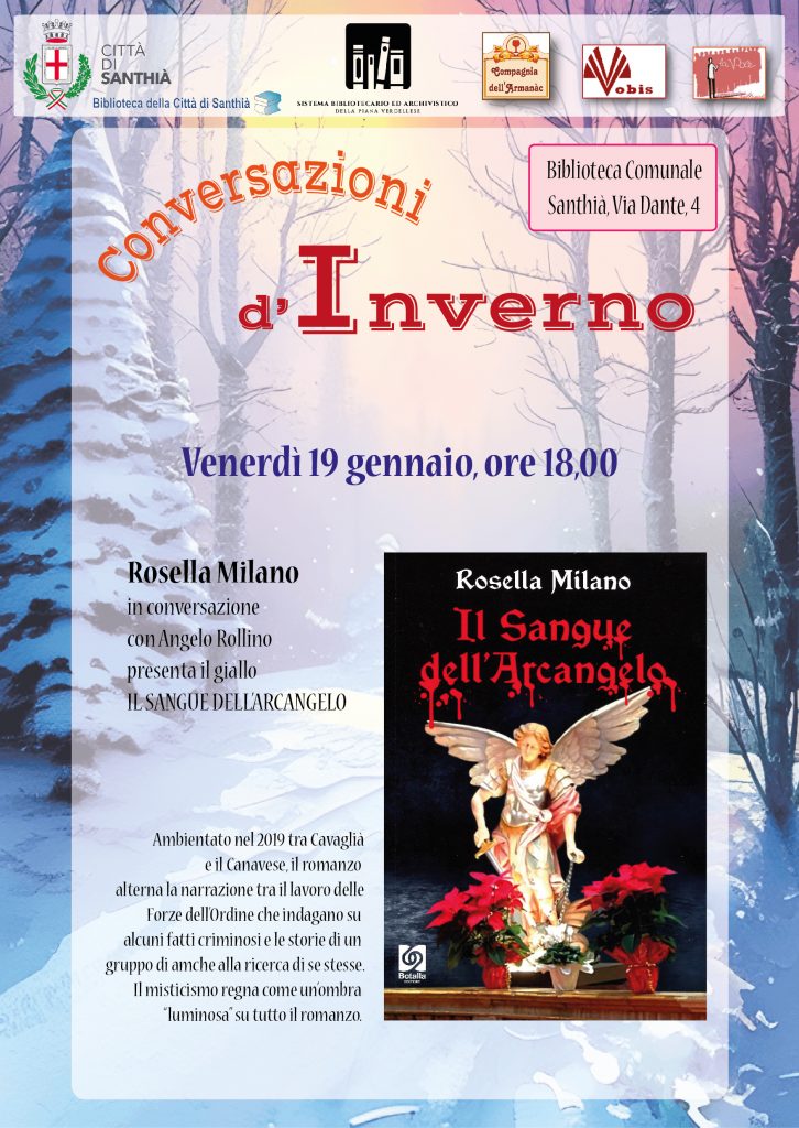 Venerdì 19 gennaio, ore 18,00, Rosella Milano di origini santhiatesi, si presenta al pubblico con un romanzo giallo “Il sangue dell’Arcangelo” ambientato nel 2019 nei territori del canavese.