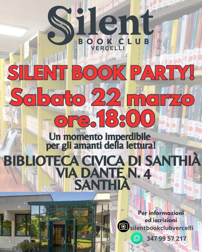 Il Silent Book Club per il mese di marzo fa tappa a Santhià, ospiti della Biblioteca Civica in via Dante n. 4 alle ore 18 di sabato 22 marzo.