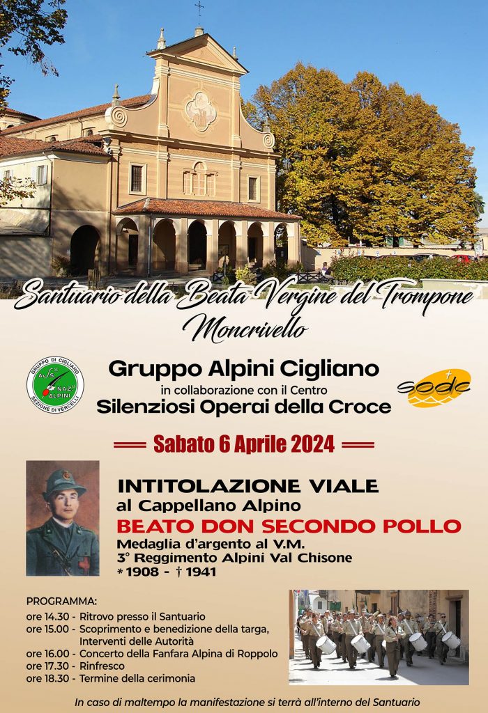 Il Gruppo Alpini di Cigliano , Sez. di Vercelli il 6 di aprile p.v. ononerà presso il Santuario del Trompone di Moncrivello il Cappellano Alpino “ Beato Don Secondo Pollo”, medaglia d’argento al V.M. intitolandogli un Viale.