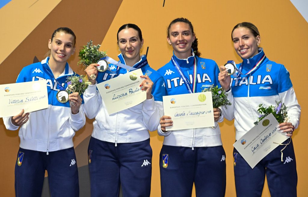 L’Italia della spada femminile ha infatti conquistato il titolo europeo Under 23 grazie all’apporto fondamentale di Gaia Caforio (Aeronautica e Accademia Scherma Marchesa) e Vittoria Siletti (Fiamme Azzurre e Ginnastica Victoria), protagoniste di una gara perfetta con le compagne Carola Maccagno e Lucrezia Paulis, guidate a fondo pedana dal maestro torinese Maurizio Mencarelli.