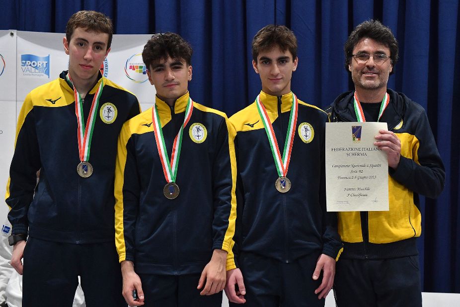 Il quartetto composto da Jacopo Poggio, Carlo Richiardi, Filippo Richiardi e Lorenzo Richiardi ha conquistato podio e promozione imponendosi per 45-17 nella finale per il 3° e 4° posto contro la Zinella Scherma San Lazzaro di Savena, dopo aver perso per 45-41 la semifinale contro l’Accademia Scherma Gallaratese, seconda a fine gara.
