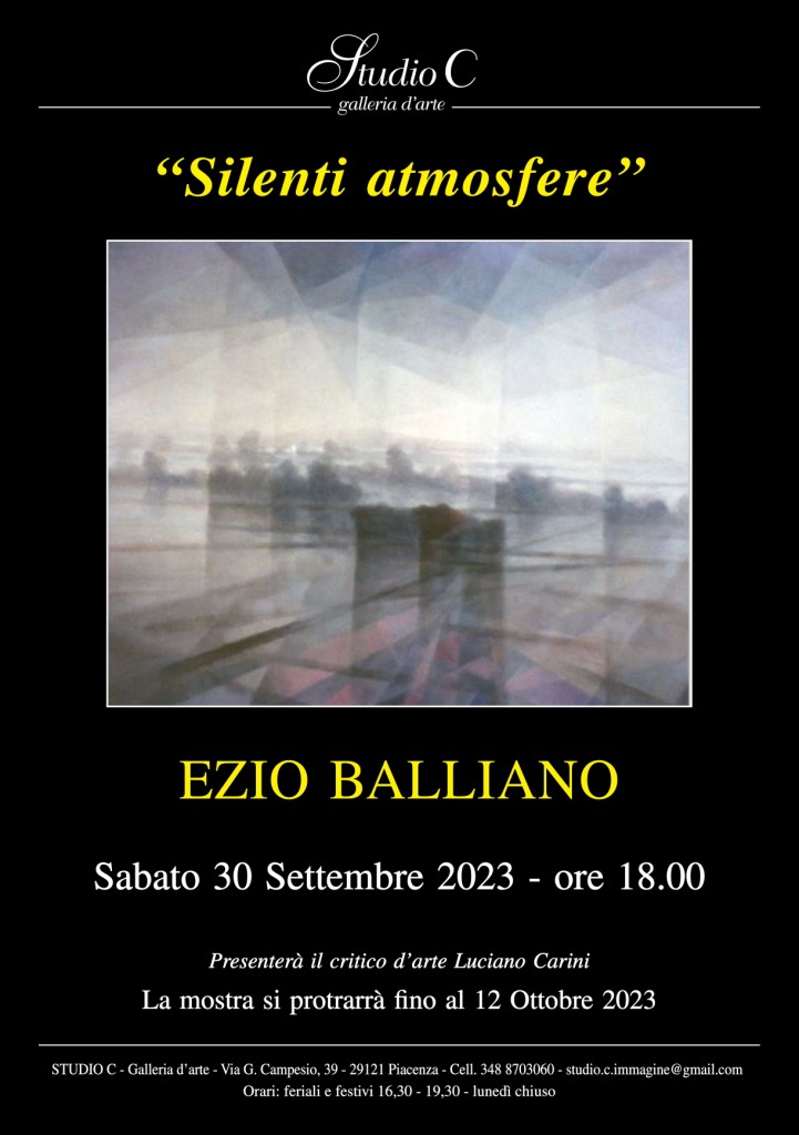 Sarà inaugurata sabato 30 settembre alle ore 18,00 presso la Galleria d’Arte Contemporanea “Studio C” di via G. Campesio 39 a Piacenza la mostra di pittura “Silenti atmosfere” del pittore vercellese Ezio Balliano che presenta opere di impronta futurista, dai colori delicati e poetici, immerse in una foschia irreale di un universo pittorico fatto di esattezza stilistica e di illusione, di razionalità e di intuizione, di sogno e realtà.