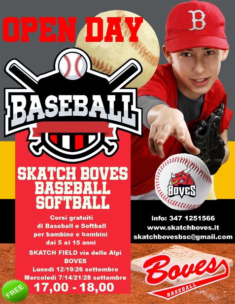 Porte aperte al campo da baseball di via delle Alpi a Boves, 7 giornate di prova gratuita per le bambine ed i bambini, le ragazze ed i ragazzi dai 5 ai 15 anni di età nel corso delle quali tecnici federali F.I.B.S. sono a disposizione per presentare i primi elementi, i fondamenti educativi e, soprattutto, il grande divertimento presenti nel giocare a baseball e softball.
